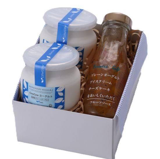 220gのプレーンヨーグルト2個とトッピング用のフルーツソースが入っております。